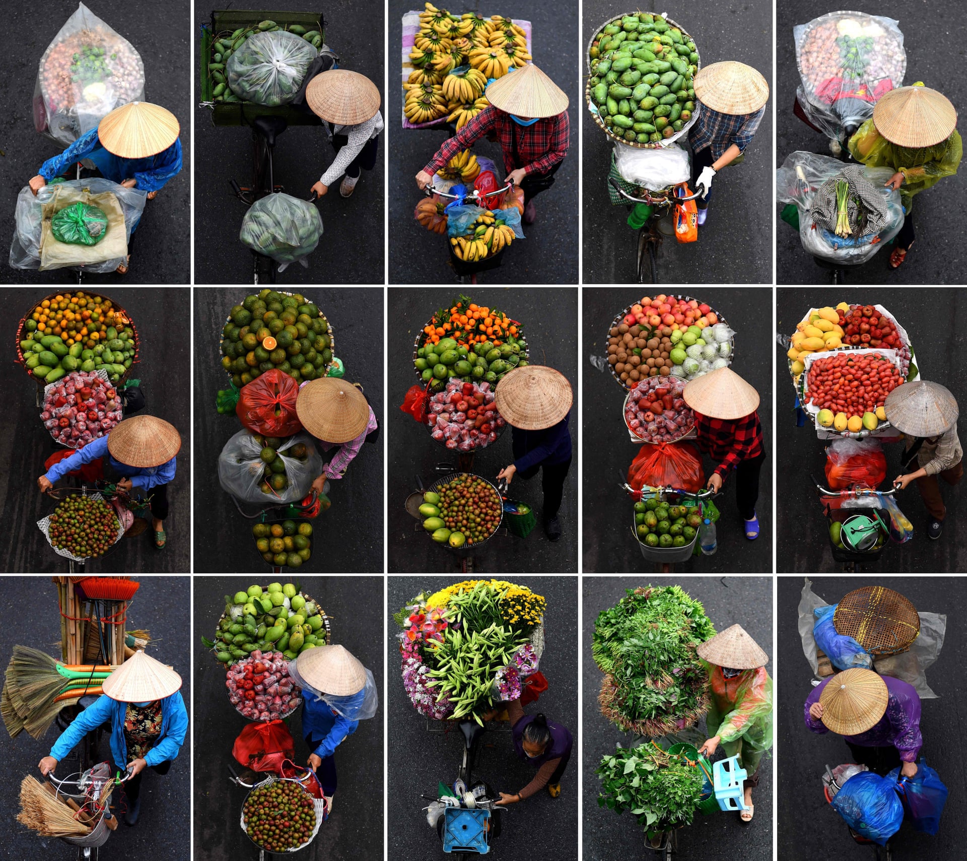 A series of photographs shows vendors carrying various goods for sale on their bicycles.
