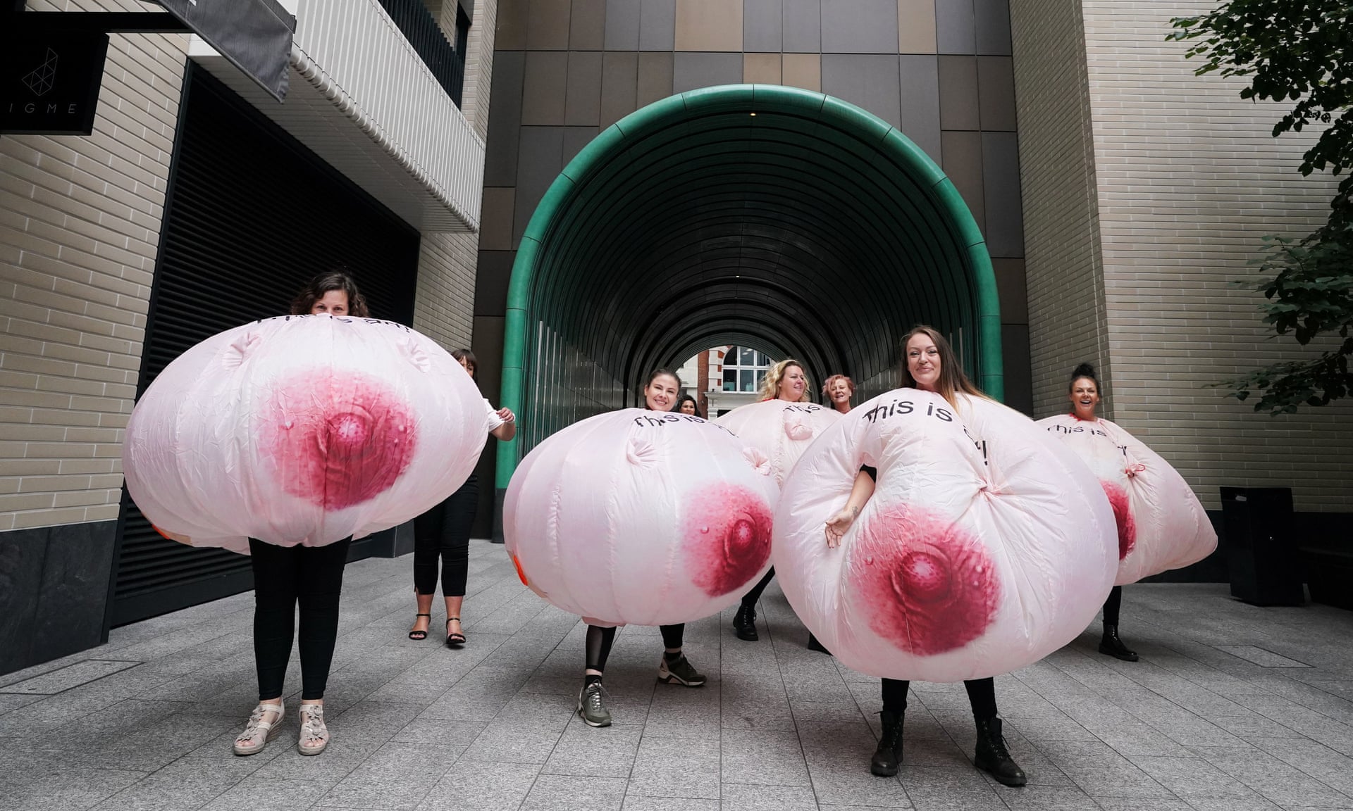 Protesters wearing inflatable breasts stand outside Facebook’s headquarters to speak out against the social media firm’s image algorithm.