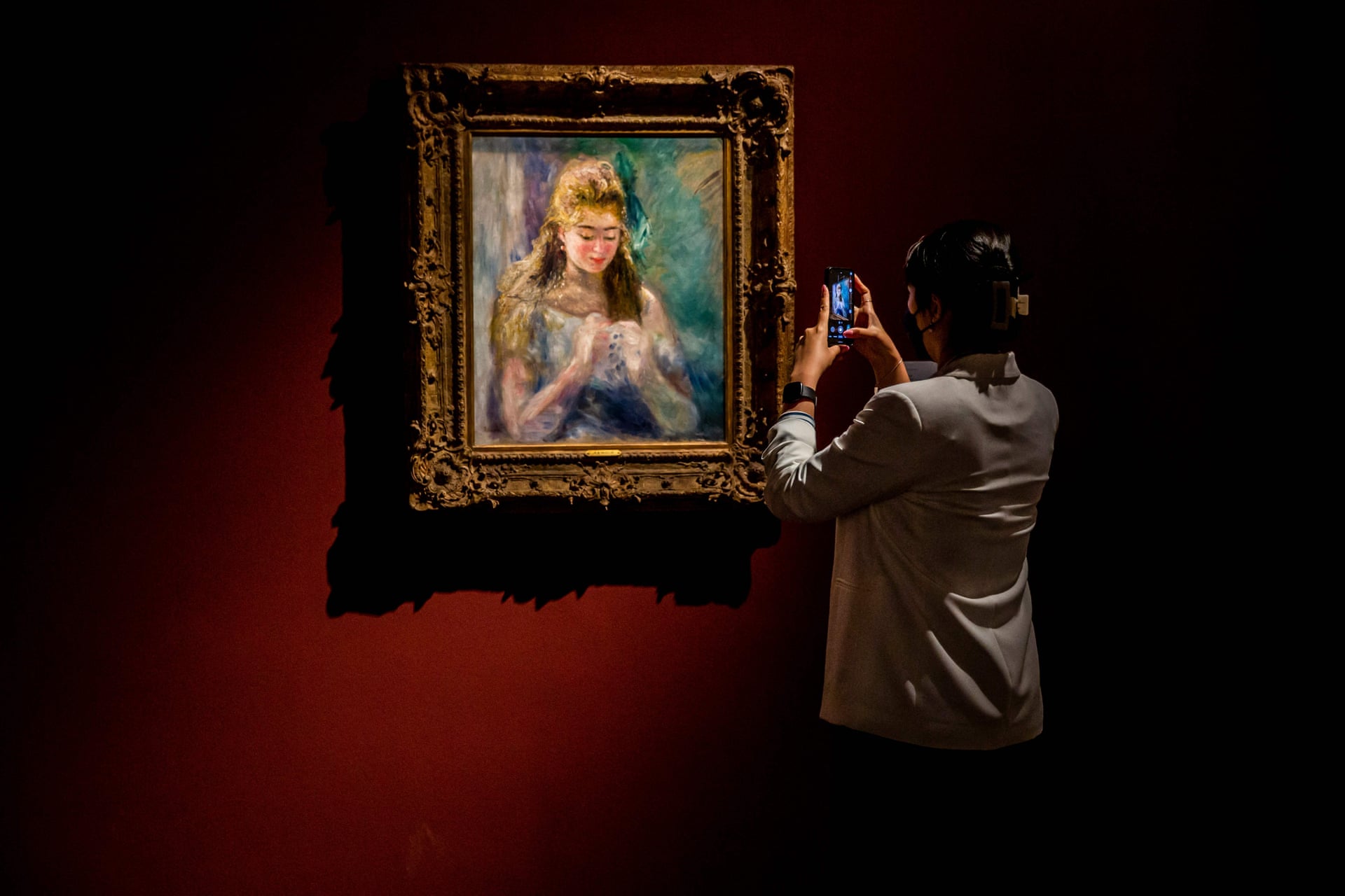 La Couseuse (The Seamstress) by Pierre-Auguste Renoir is displayed at a Sotheby’s auction exhibition.